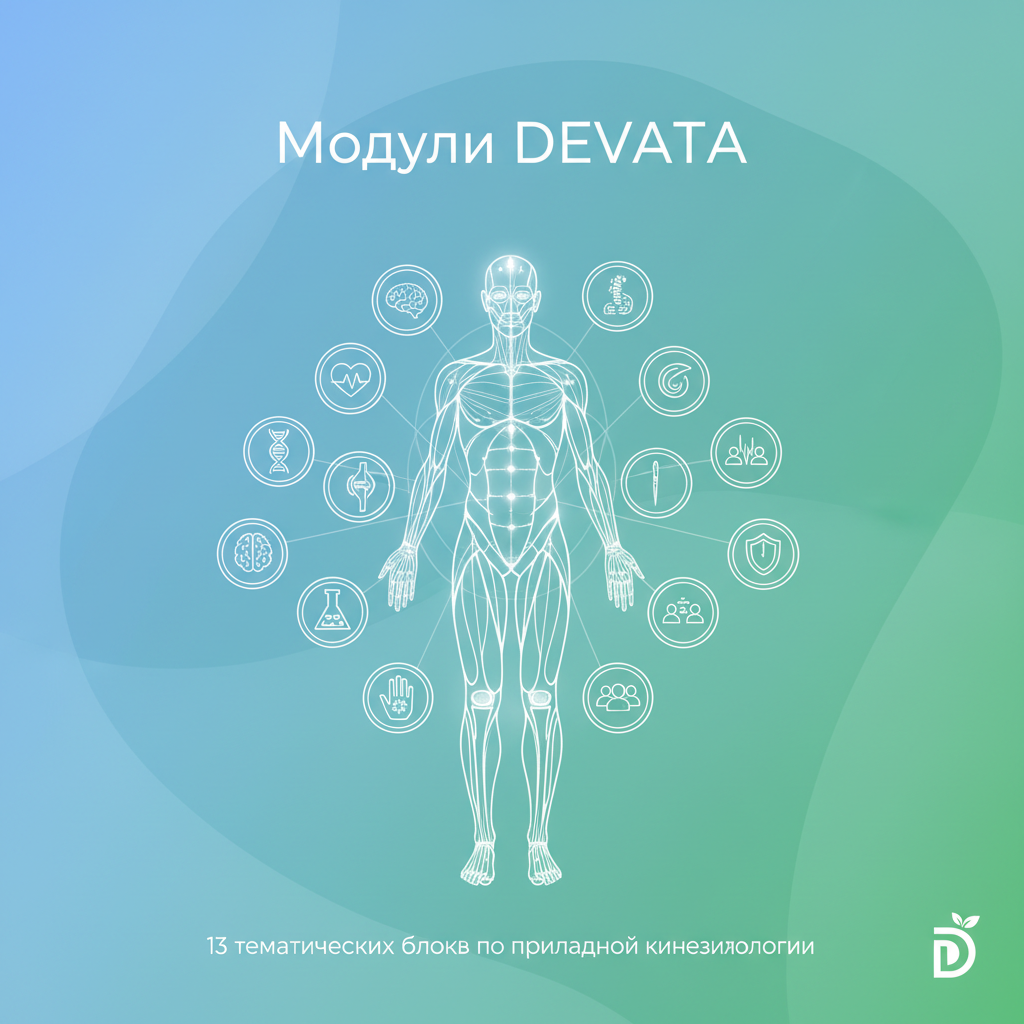 Программа DEVATA по прикладной кинезиологии состоит из 14 модулей, каждый из которых представляет самостоятельный тематический блок с теорией и практикой. Они выстроены по принципу «от простого к сложному»: начиная с базовых навыков мышечного тестирования и заканчивая интеграцией всех аспектов (структура, биохимия, психика, энергия) в целостный подход. Вы можете проходить модули последовательно для глубокого освоения или выбирать акценты в зависимости от вашей специализации — рекомендации по выбору указаны для каждого блока.